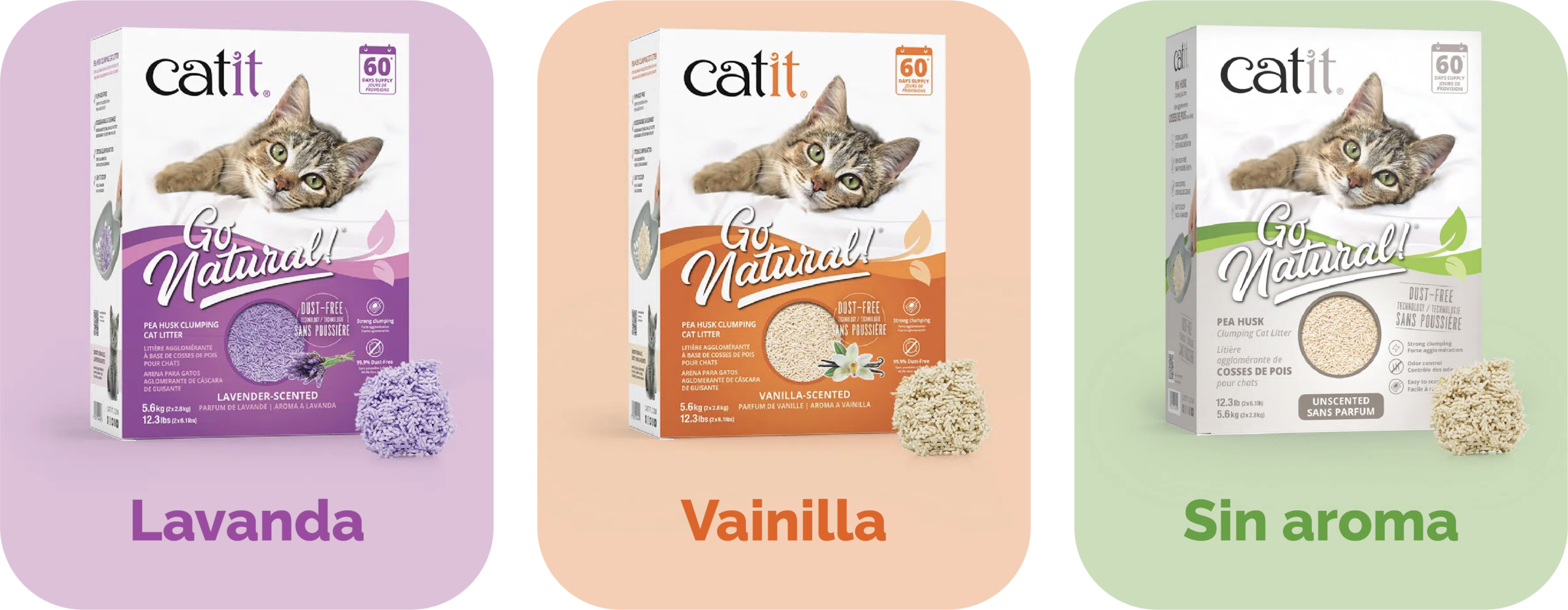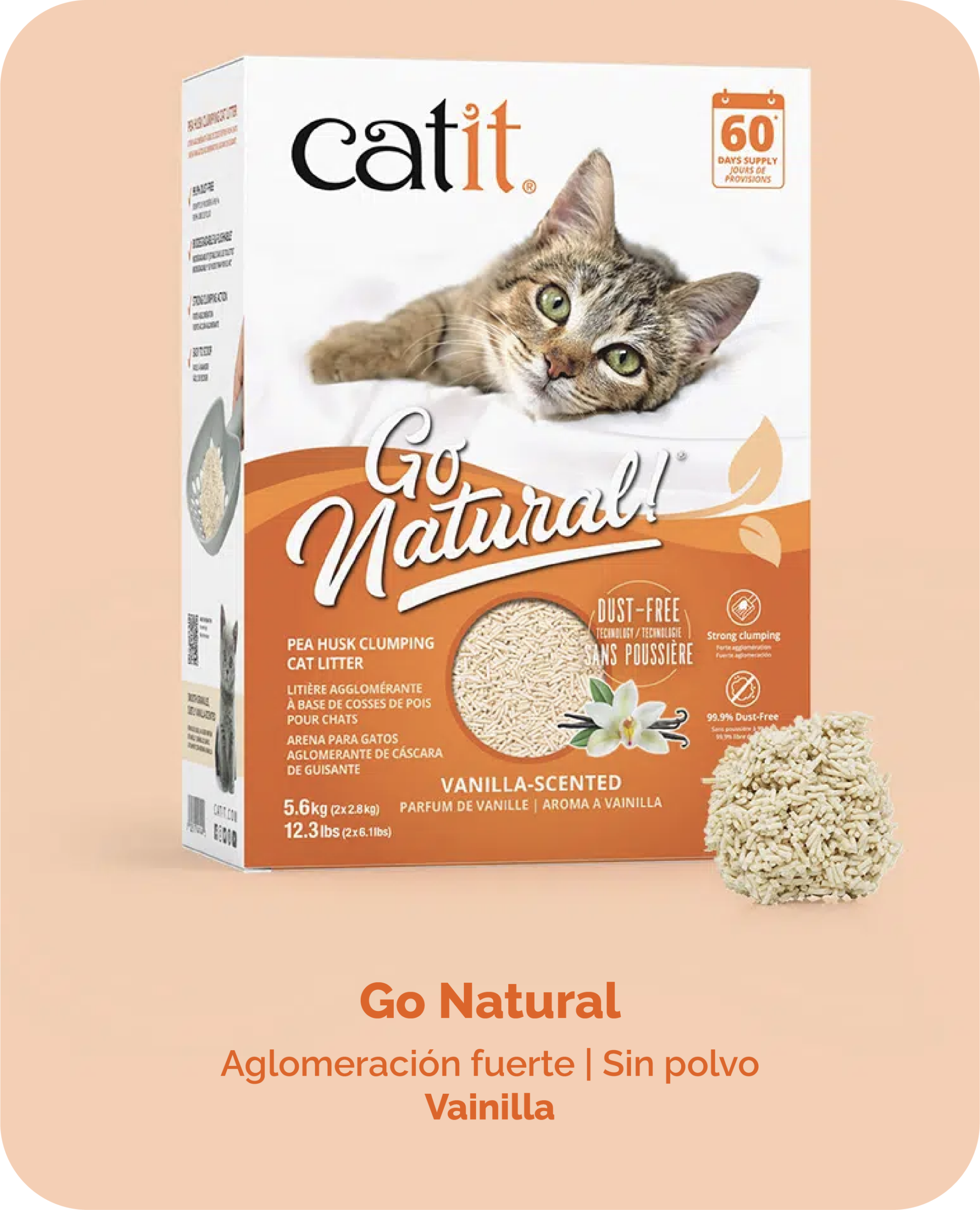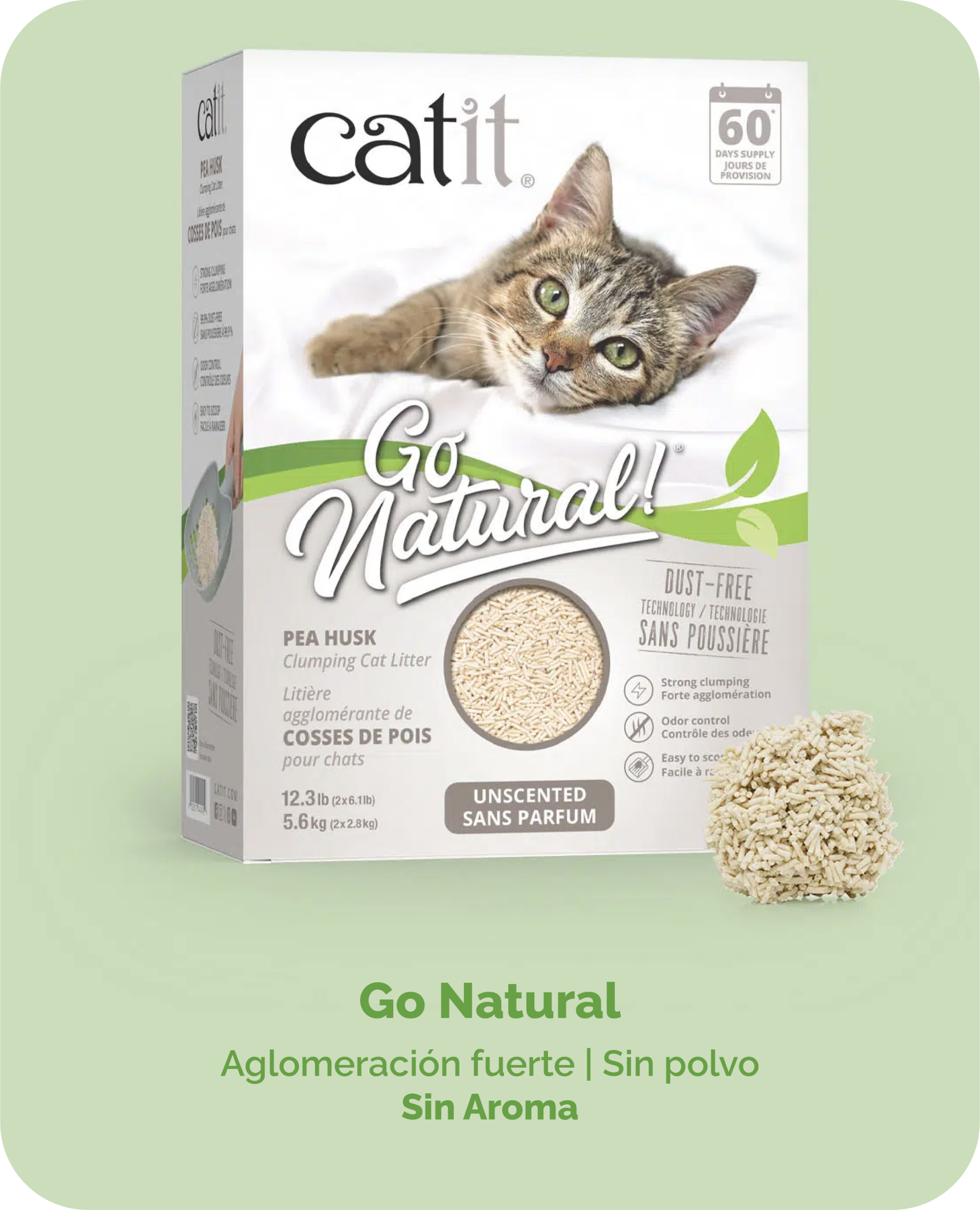 Las arenas para gatos Catit Go Natural están hechas con cáscara de arvejas, ofreciendo una mejor aglomeración que otras arenas vegetales, polvo casi inexistente, fácil limpieza y un mayor control de olores.